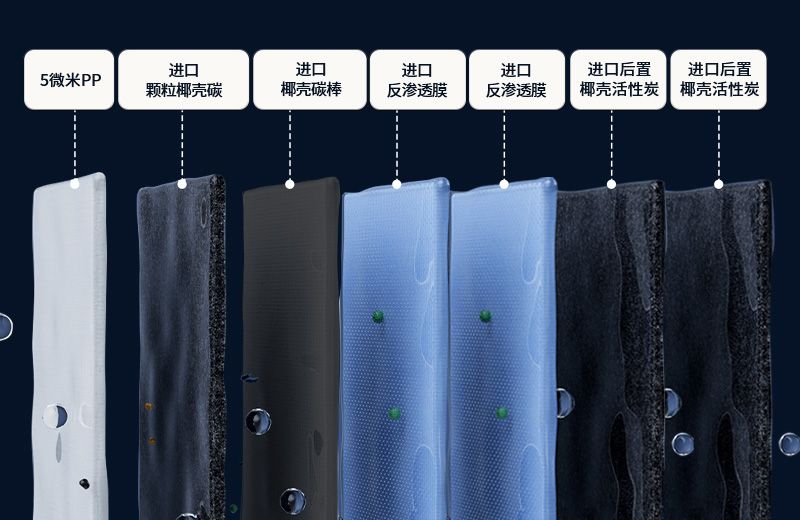 5微米PP+進口顆粒椰殼炭+進口椰殼碳棒+雙進口膜片反滲透膜+雙進口後置椰殼活性炭