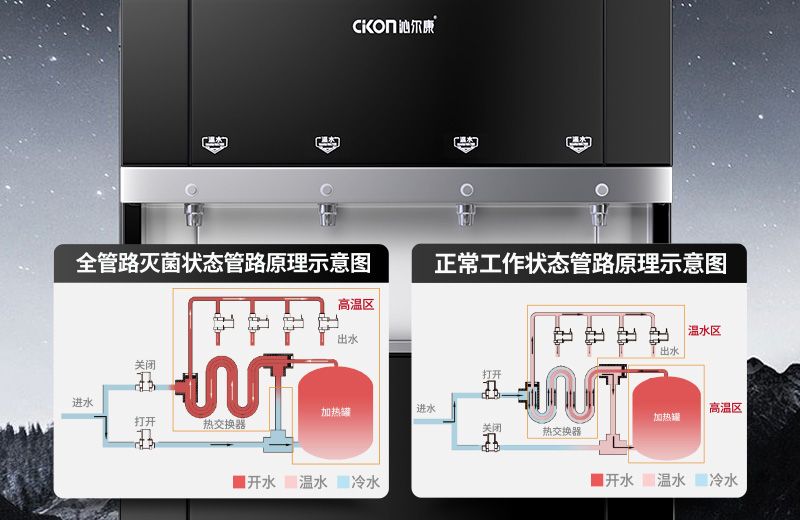 沁爾康發明專利技術(shù)——全管路(lù)高溫熱(rè)水殺菌,通過電腦精确控制,每天定時利用開水自(zì)動對内部管路(lù)進行高溫消殺,殺菌效果遠(yuǎn)超行業水平。