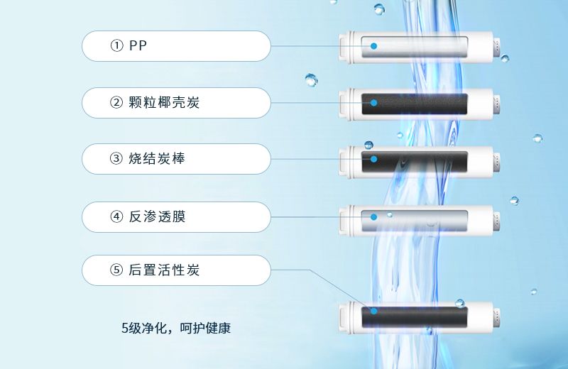 PP+顆粒活性炭+燒結炭棒+反滲透膜+後置活性炭