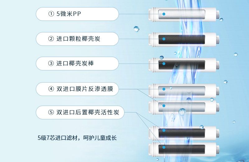 5微米PP+進口顆粒炭+進口炭棒+雙進口膜片反滲透膜+雙進口後置活性炭,淨化出水爲如(rú)山(shān)泉般甘甜的淨飲水,适用于後廚烹饪、色拉、煲湯、泡發幹貨等,還(hái)原食物本味。