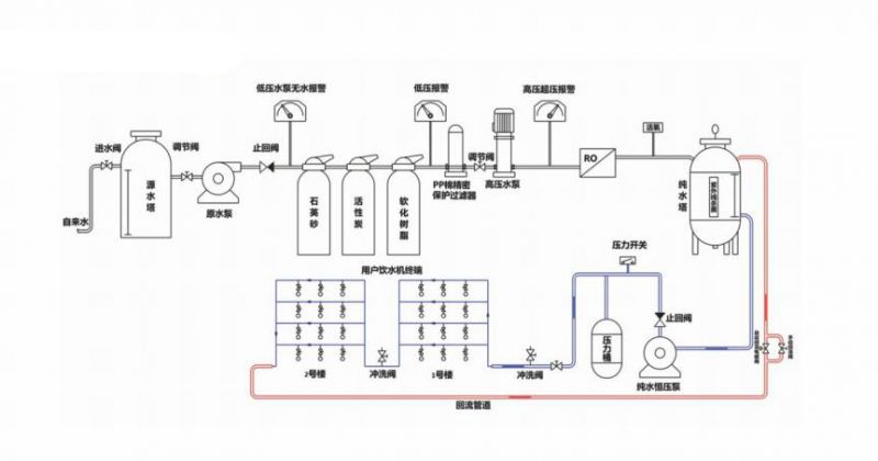 通過淨水輸送管路(lù),将淨化水輸送到各飲水點